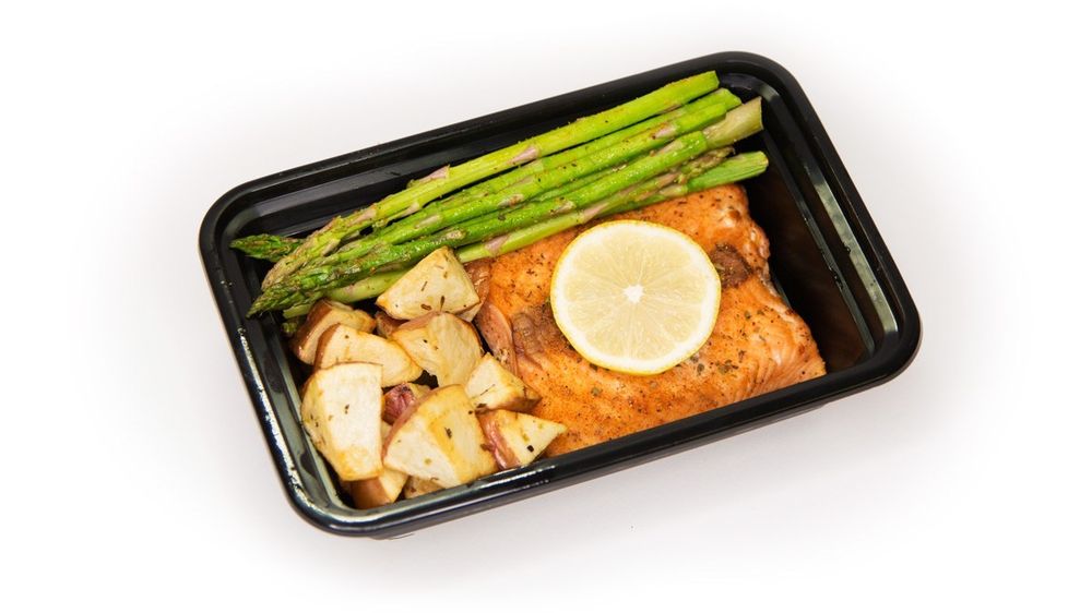 Seasoned Salmon with Asparagus and Red Potatoes . MACROS Protein 34g Fat 9g Carbs 26g Calories 321